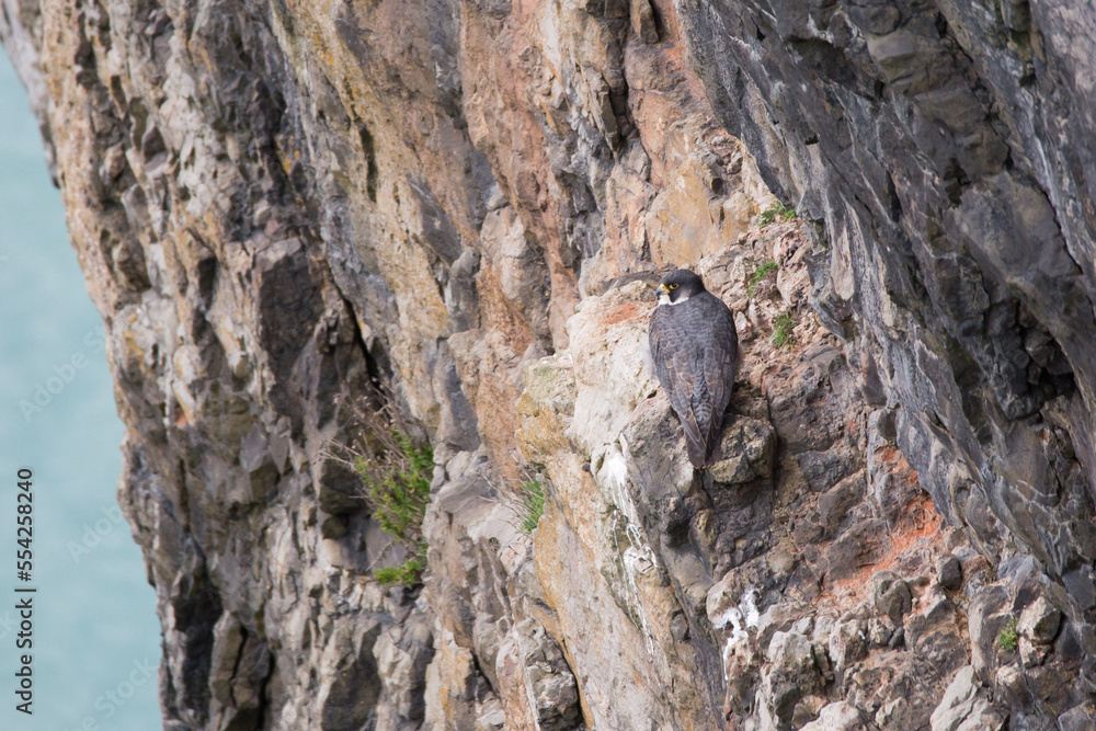 Peregrine Falcon perched on a cliff, Pembrokeshire coast, Wales.