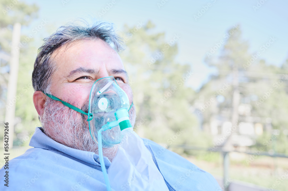 Overweight 60 year old male patient recovers from his respiratory disease using a portable oxygen concentrator on the terrace of his house. Aftermath after suffering from COVID-19.