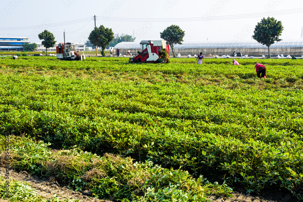 Farmers use tractors pulling is harvest peanuts in Yunlin County, Taiwan.