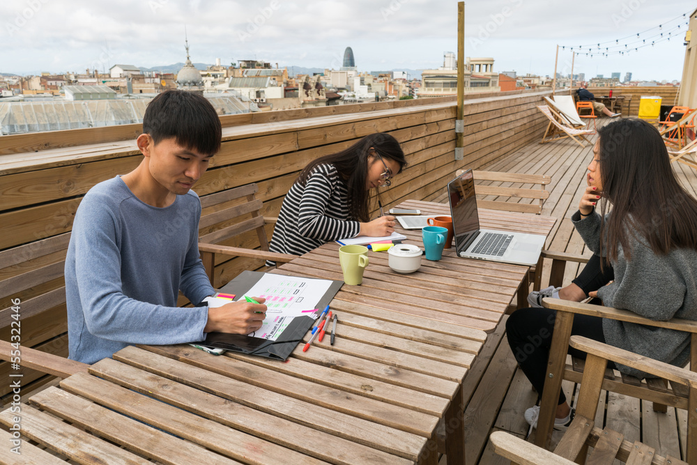 Young Asian people sitting at table outdoors and using laptop and tablet while working.