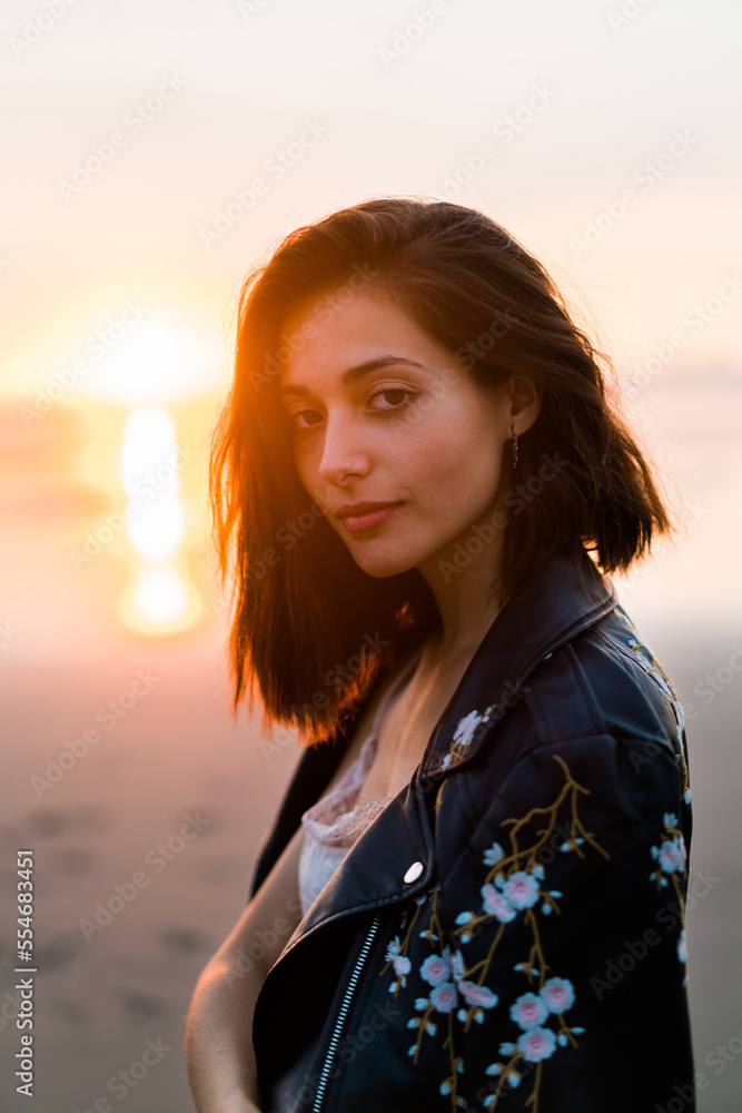 Closeup portrait of a young caucasian woman looking at camera with sunset backlight in the background.