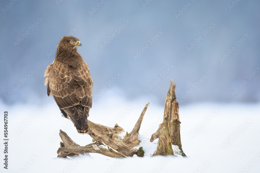 landing Common buzzard Buteo buteo in the fields in winter snow, buzzards in natural habitat, hawk bird on the ground, predatory bird close up winter bird