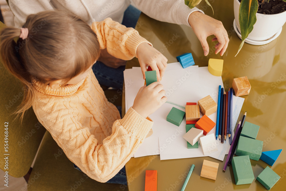 Mom is playing with her daughter. Mom and little girl built a tower of colored blocks. Classes with a child. kid building multicolored wooden blocks. Baby sitter