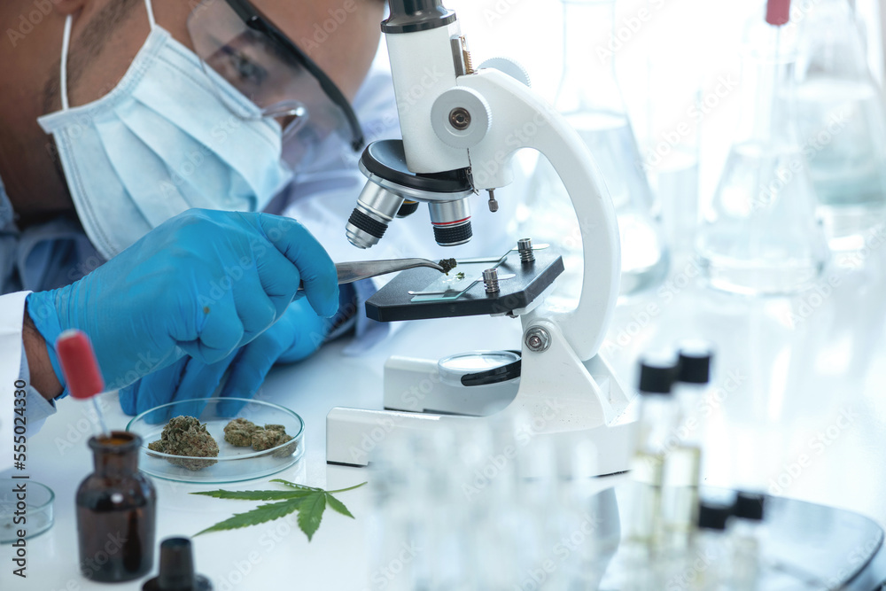 Researcher man wears safety glasses groves and mask using tweezer taking Cannabis for test under microscope, biotechnology scientist working in laboratory