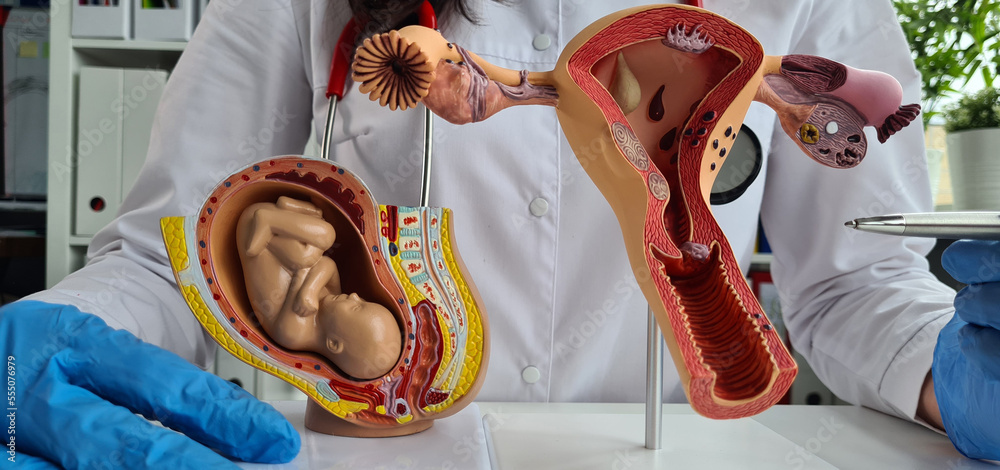 Doctor explains process of fertilization to patient on artificial models of uterus and fetus