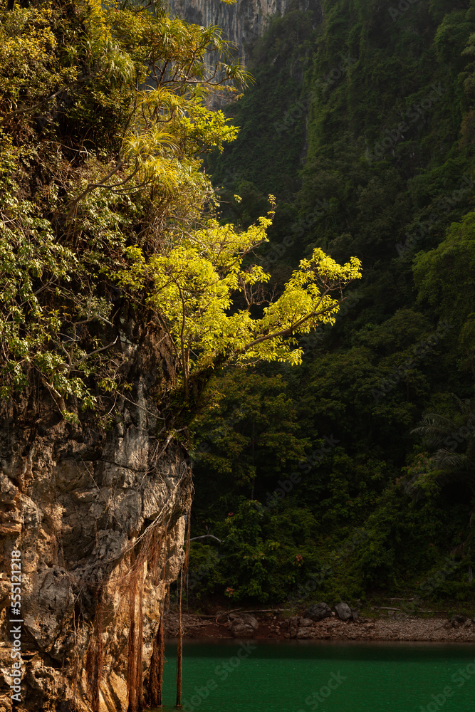 Landscape of karst mountains, covered with rainforest and vegetation at Cheow Lan Lake, inside Khao Sok National Park, Thailand