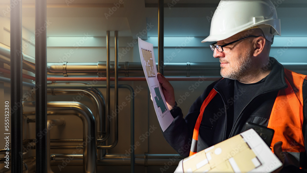 Architect in basement. Man with construction drawings near pipes. Design of engineering communications. Man inspector checks basement. Architect in helmet and orange vest. Boiler room architect