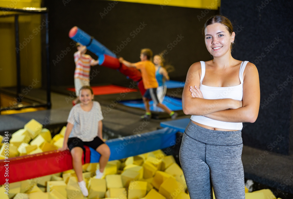 Cheerful young girl in sportswear standing indoors near foam pit with battle beam on background of happy children playing in inflatable playground ..