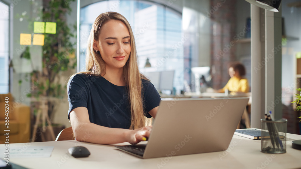 Beautiful Female in a Black Casual Dress Sitting at a Desk in Creative Office, Working on Tasks on Laptop Computer. Young Creative Specialist Writing Corporate Project Plans for Marketing Agenda.