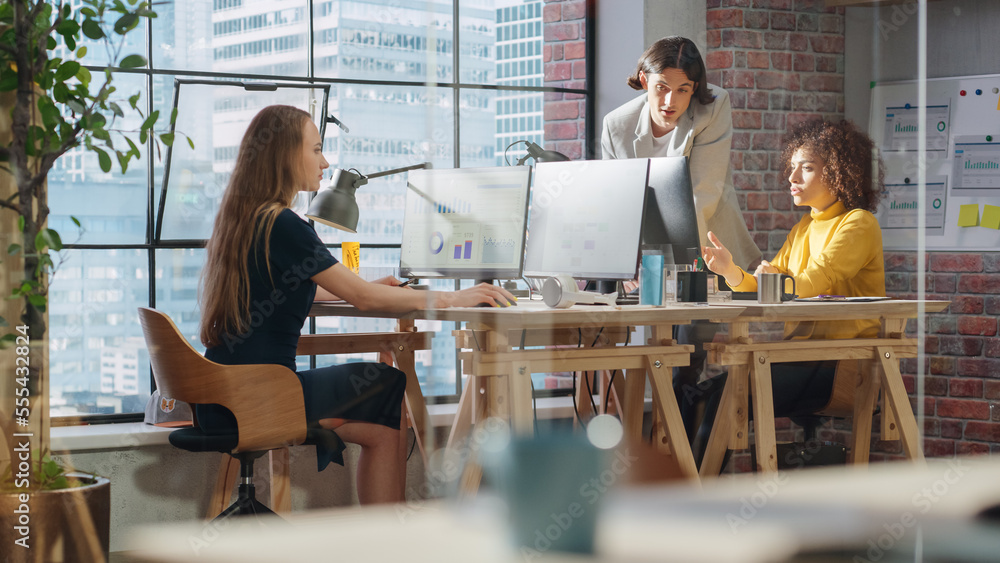 Creative Multicultural Colleagues Collaborate on a Project and Work Together as a Team. Marketing Manager and Designer Talking and Discussing Changes to an Advertising Campaign for a Startup.
