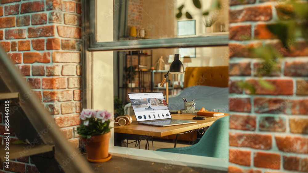 Laptop Computer with Online Shopping Website Display Standing on a Table in Stylish Living Room. View from Outside the Window of a Brooklyn-Style Brownstone Building. Work from Home Concept.