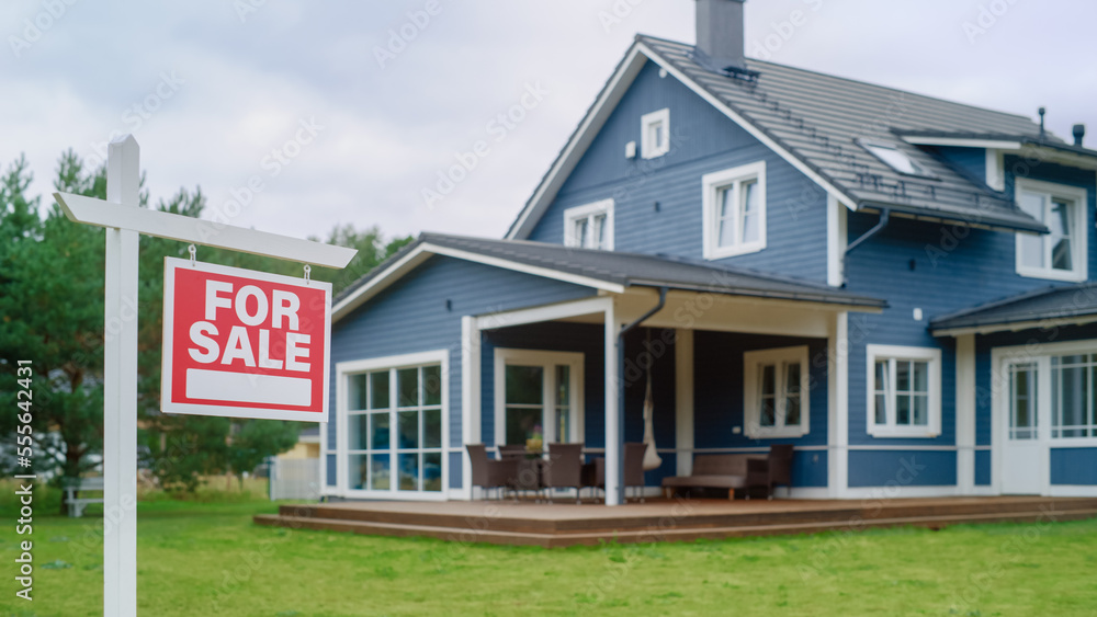 Red Home for Sale Sign in Frontyard of a Big Blue Stylish House with Traditional Architecture. Housing Market Concept with Residential Property on Sale in the Suburbs.
