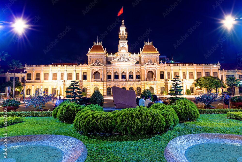 Night scene of the Ho Chi Minh City Hall in Saigon, Vietnam.