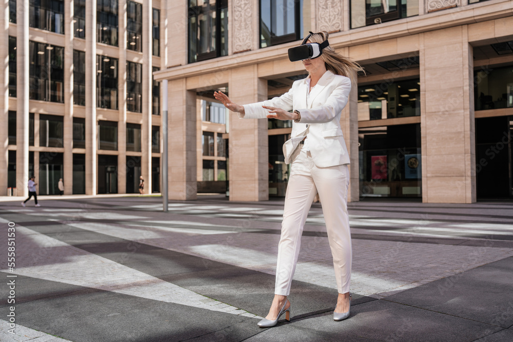 Elegant caucasian woman in white suit using virtual reality glasses in the city. Young entrepreneur swedish woman in vr headset in virtual reality outdoors against buildings. Technology and leisure.