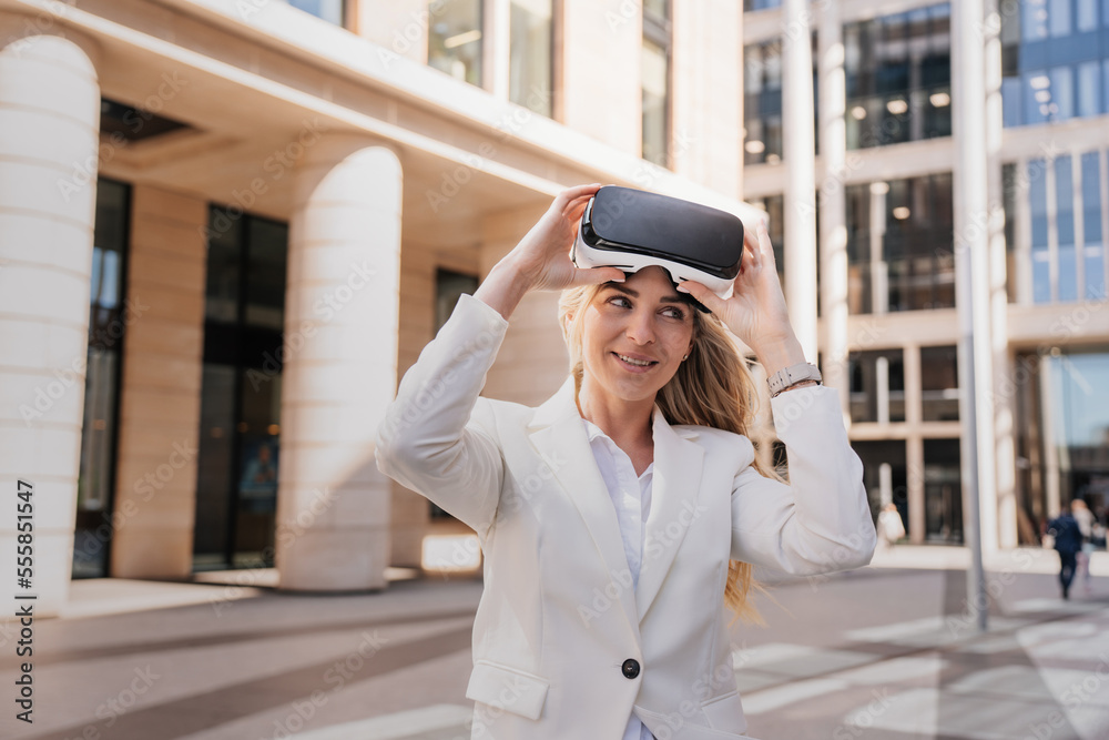 Attractive Italian blonde young woman in white suite trying a vr glasses, excited after virtual reality experience. Smiley student girl in white suit outdoor at break. Technologies and entertainment.