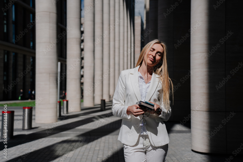 Positive young caucasian woman in white suite stands eyes closed among huge columns of business center building looking up, holding diary. Successful businesswoman got a great deal. Financial people.