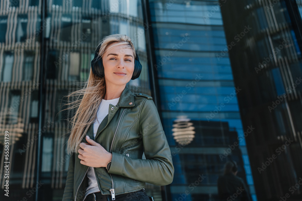 Confident blonde girl in headphones with loose hair, leather jacket and white t-shirt smiling, enjoys music outdoors. Swedish young woman at weekend walks in the city. Youth, hipster. People outdoors.