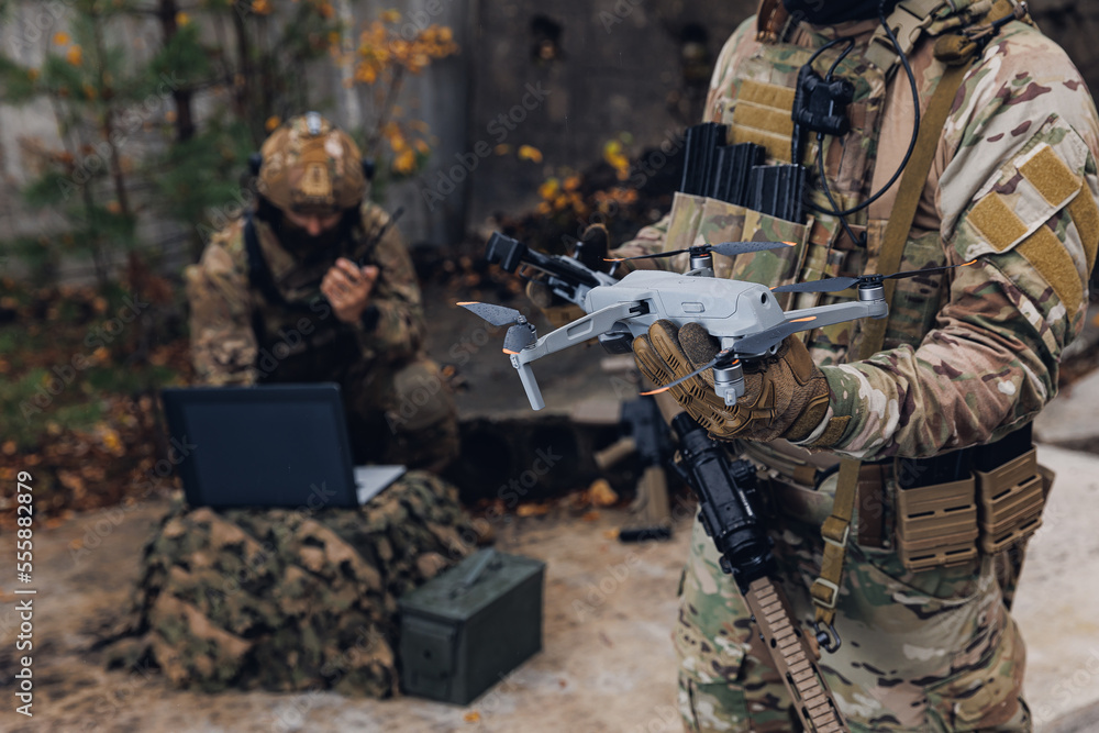 Modern army soldiers using aerial drone for artillery guidance and scouting view enemy positions in military operation