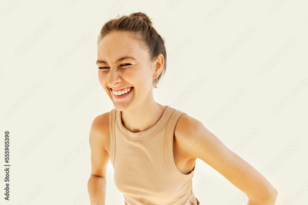 Positive emotions, lol. Sense of humor. Studio shot of cheerful woman laughing out loud with perfect white teeth and closed eyes after hearing funny joke of her friend, isolated on white background