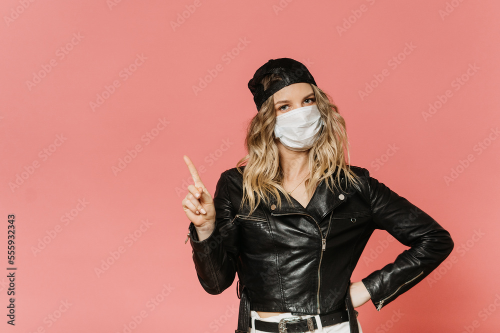 Young pretty blonde girl in surgical mask wearing black leather jacket, white jeans, and a cap, pointing on free space warns about coronavirus pandemic, isolated on pink. Covid-19 concept.
