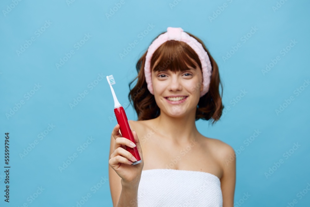a pleasant, happy woman stands on a blue background in a towel, smiling happily and holding a red electric brush in her hand