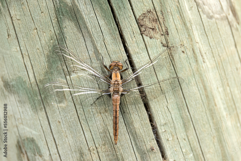 chalk-fronted corporal, Ladona julia, teneral, perched on a dock