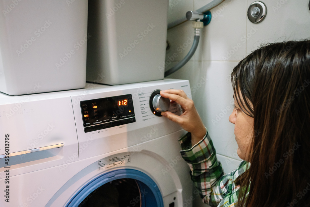 woman puts washing machine at home