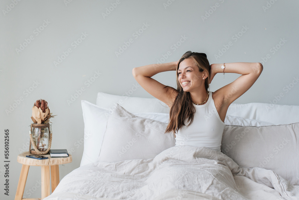 Successful caucasian pretty woman sitting on bed toothy smiles awakes at weekend morning streching looking aside. Beautiful Italian female satisfied by healthy sleep. Mockup, Women health.