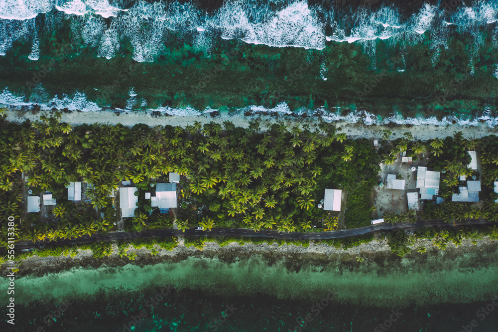 Tuvalu (Funafuti) aerial shot of one of the thinest part of the island where the ocean and lagoon can be seen together .