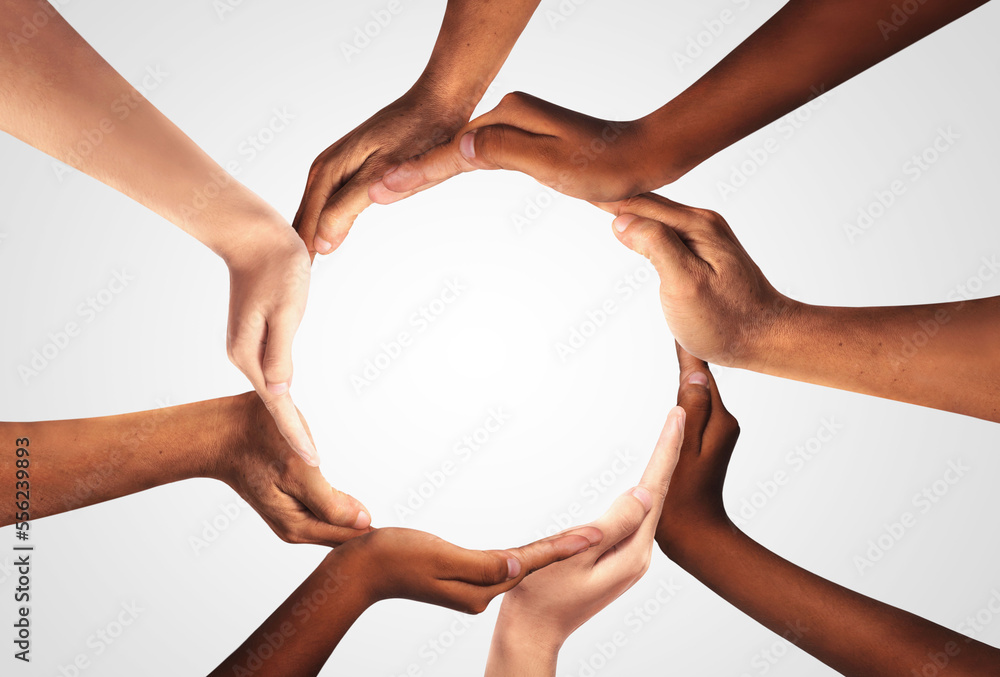 Conceptual symbol of multiracial human hands making a circle on white background with a copy space in the middle. The concept of unity, cooperation, partnership, teamwork and charity.