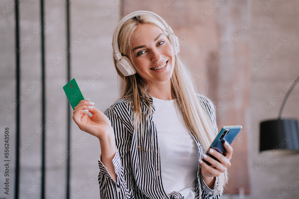 Adorable young Swedish woman in headphones looks happily holds credit card and phone amazed by discount, sale, Black Friday. Excited girl online purchase. Cute caucasian girl makes purchase.