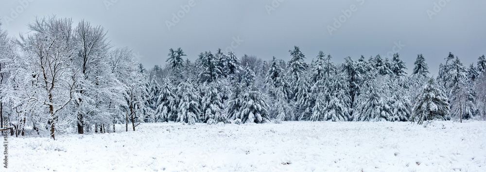 Snow covered pine and hardwood trees in Wisconsin
