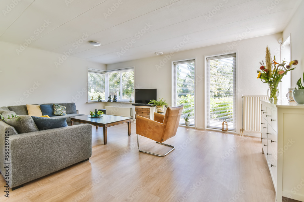 a living room with wood flooring and white walls, including a grey sofa set in the center of the room