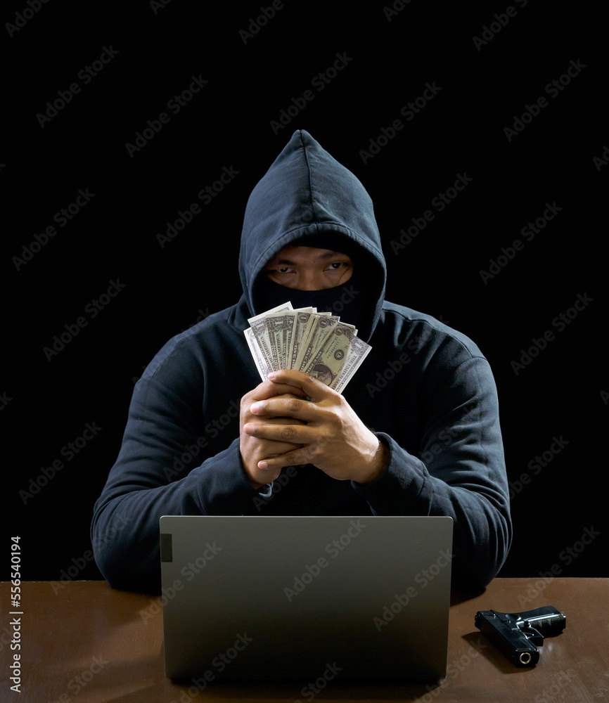Hacker spy man one person in black hoodie sitting on a table looking computer laptop used login password attack security to circulate data digital in internet network system, night dark background.