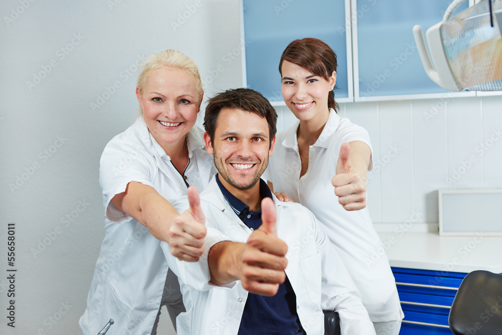 Zahnarzt und Team halten Daumen hoch