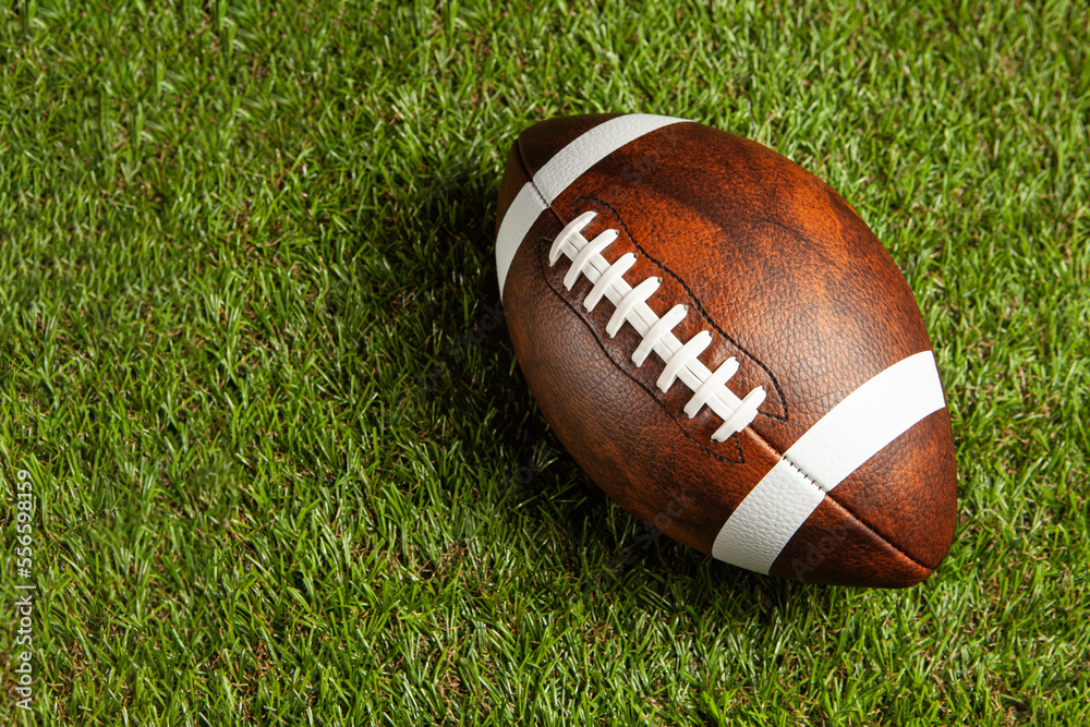 American football ball on green grass field background. Top view.