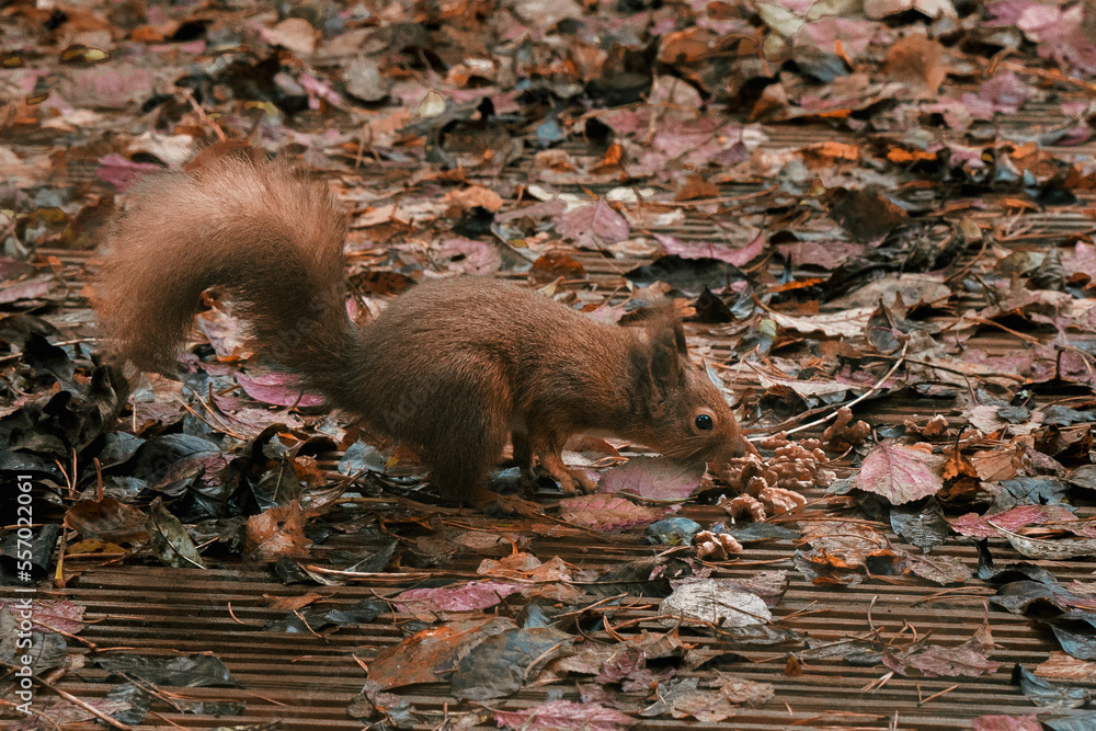 Red Squirrel on autumnal leaves on patio