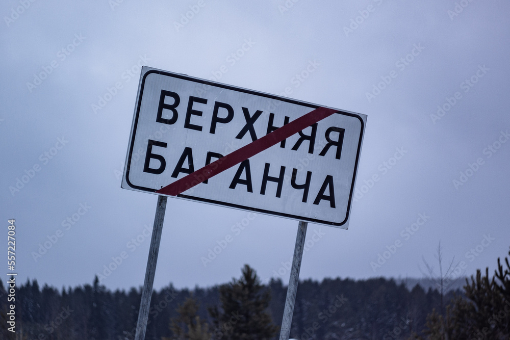 Road sign - the end of the settlement - "Verkhnyaya Barancha", December 2022.