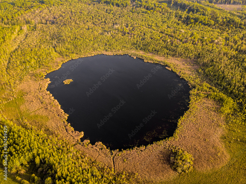 Aerial drone photo of deep, round lake in middle of forest in Latgale, Latvia