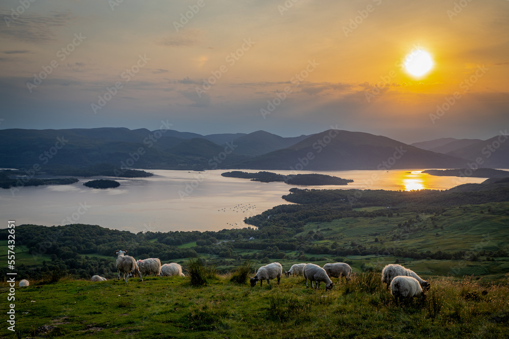 Photographie de paysage d'un coucher de soleil sur le loch lommond écossais depuis conic hill (balmaha) avec des moutons en avant-plan