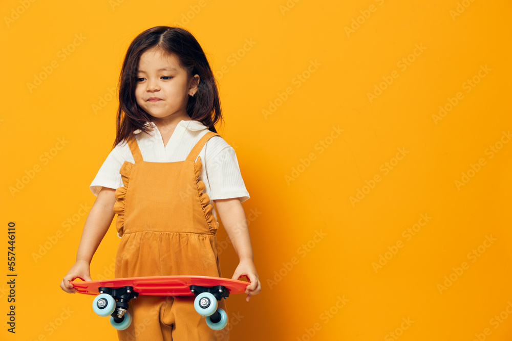 joyful, happy, little girl in an orange sundress stands on an orange background holding a small skateboard in her hands. Themes of hobbies, entertainment and outdoor activities