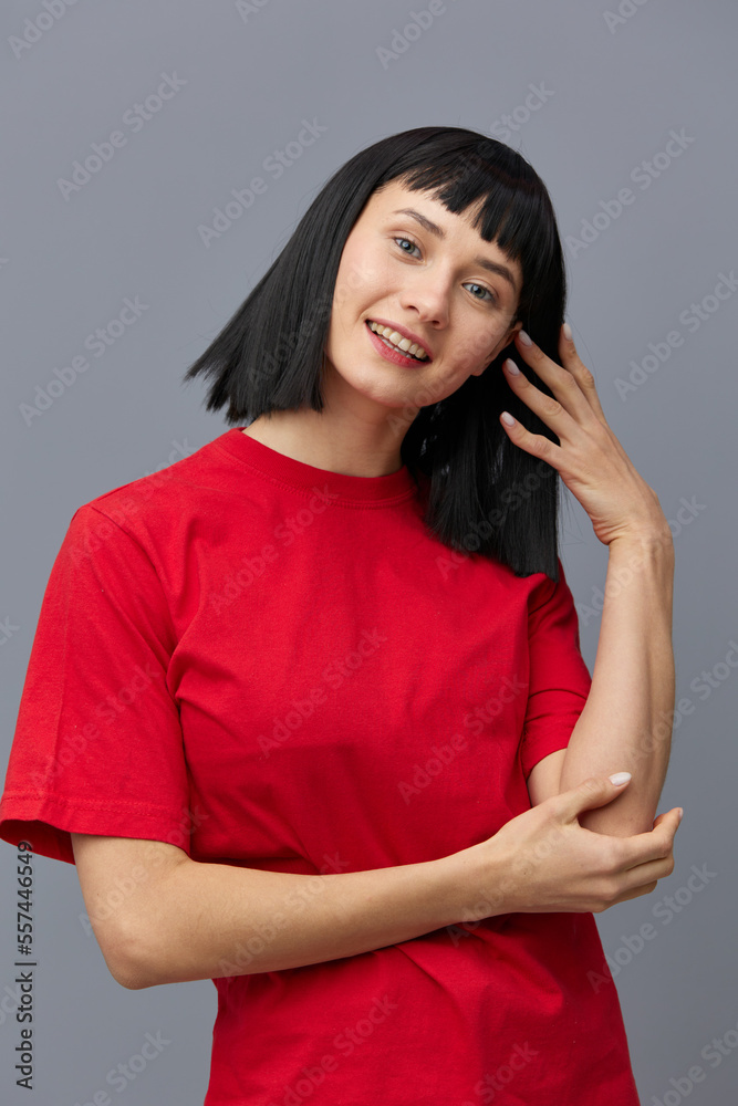 a sweet, beautiful, attractive woman stands on a gray background in a red T-shirt and touches her hair with a gentle hand gesture, smiling pleasantly