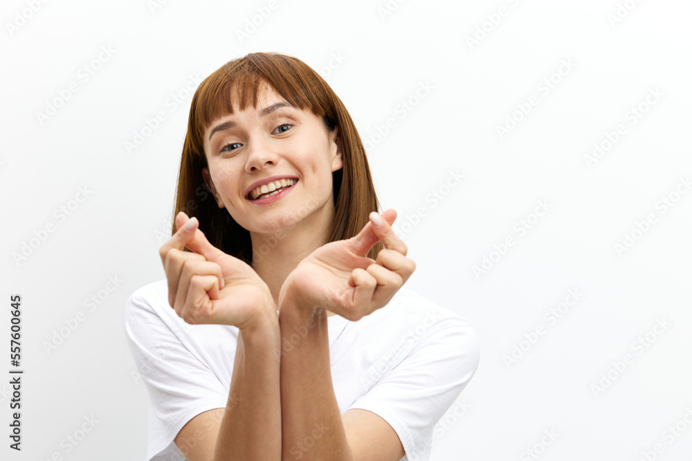 a happy, sweet, inspired red-haired woman stands on a white background in a white T-shirt and, smiling pleasantly at the camera, shows a heart in Asian style with her fingers