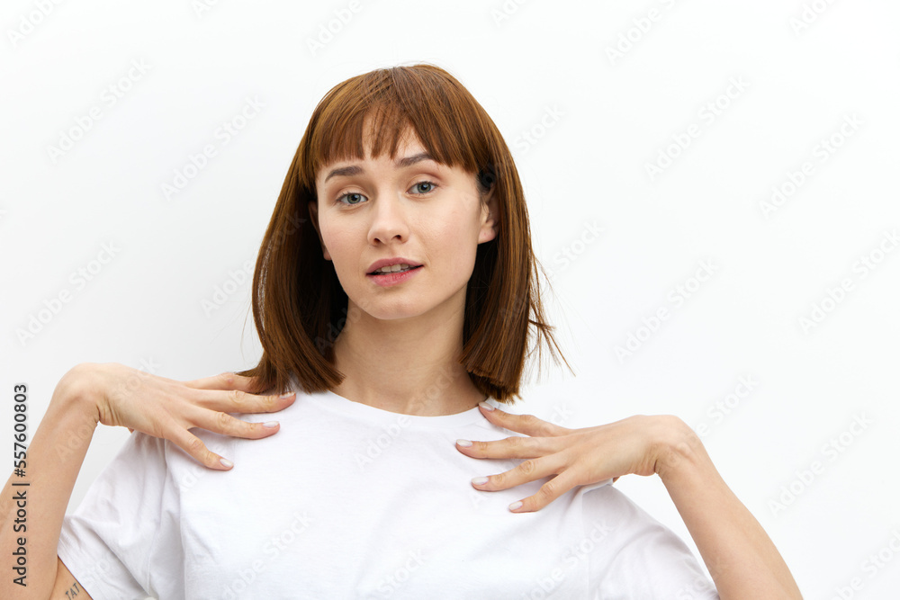 emotional woman smiles broadly and gestures with her fingers at her T-shirt Horizontal studio photo with empty space