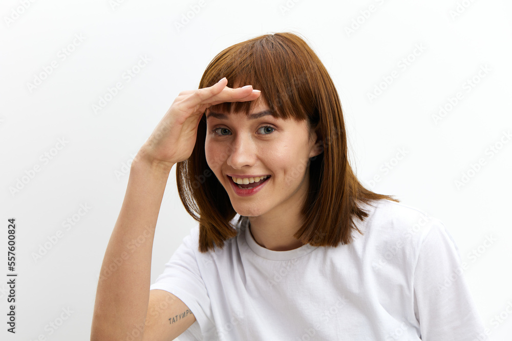 a funny, funny, cheerful woman stands on a white background in a white T-shirt and leaning her hand to her forehead looks at the camera smiling sweetly