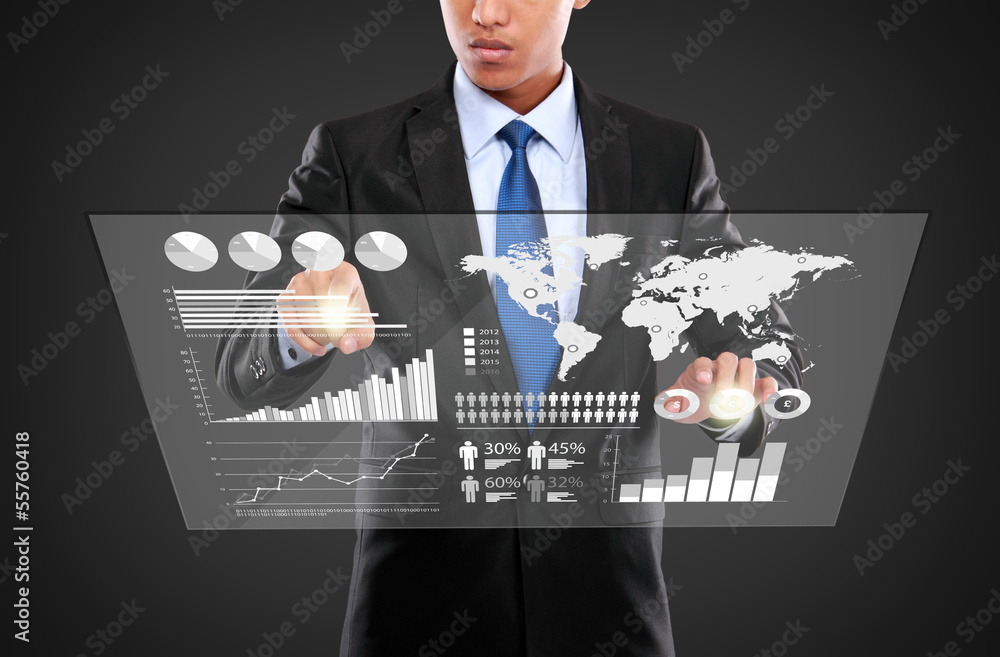 man pushing on a touch screen of infographics