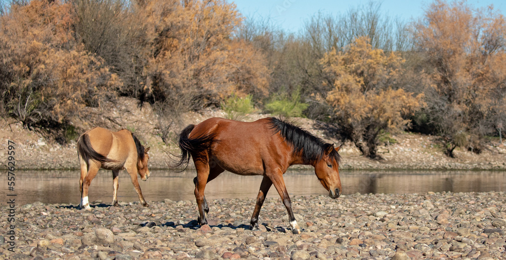 Bay and dun wild horse mares swishing tails while walking next to Salt River near Phoenix Arizona United States