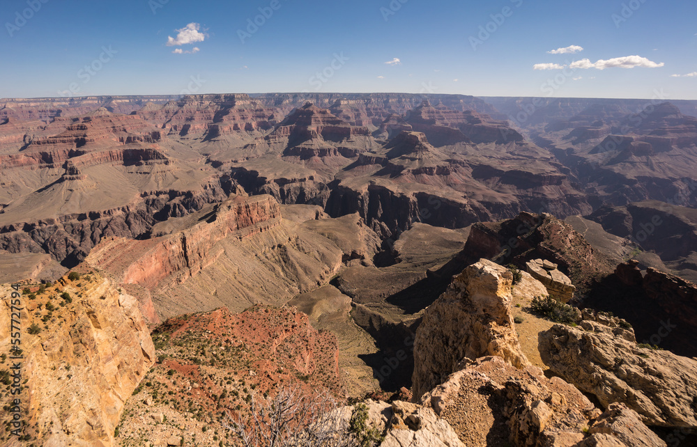 Wide angle photo of Grand Canyon deep valleys and stone walls in midday