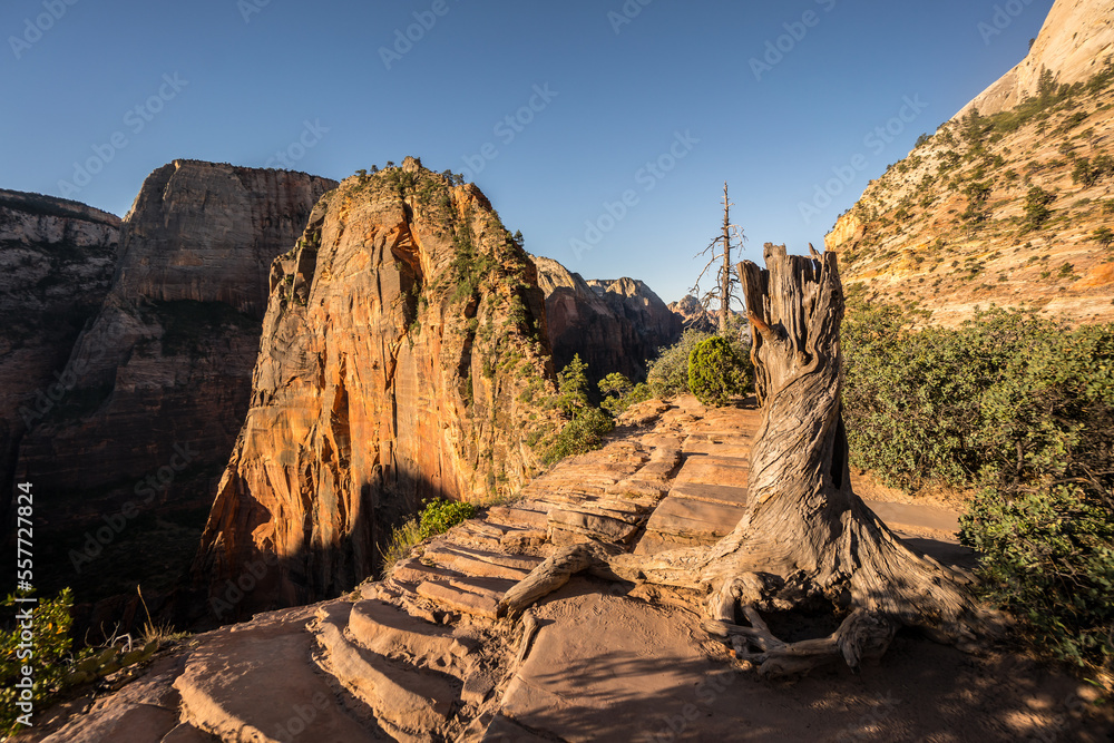 Angels Landing trail in Zion National Park, early morning sunrise