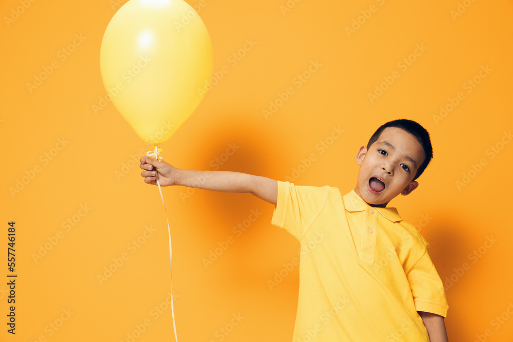 a funny, happy boy stands in a yellow T-shirt with a yellow balloon nga outstretched hand and smiles joyfully looking at the camera